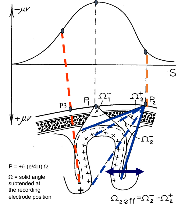 Figure 89. Orientation of the signal influences the amplitude captured in the EEG. Negative values are the result of the electromagnetic field imposed by the dipole in which there is electronegativity closer to the electrode (fEPSPs).